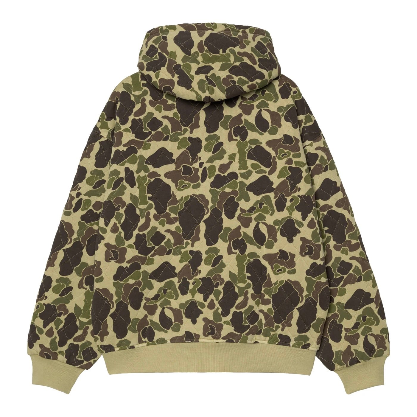 フードデッドビスタキルテッドスウェットジャケットは、ダイヤモンドキルティング加工を施した厚手のコットン生地で作られています。バルーンフィットのシルエットは、ややゆったりとしたボックスシルエットでありながら、ドロップショルダーとフィット感のある裾が特徴です。調節可能なフードとカンガルーポケットを備えており、胸元にはオーバーダイ加工のカーハートスクエアラベルが配されています。