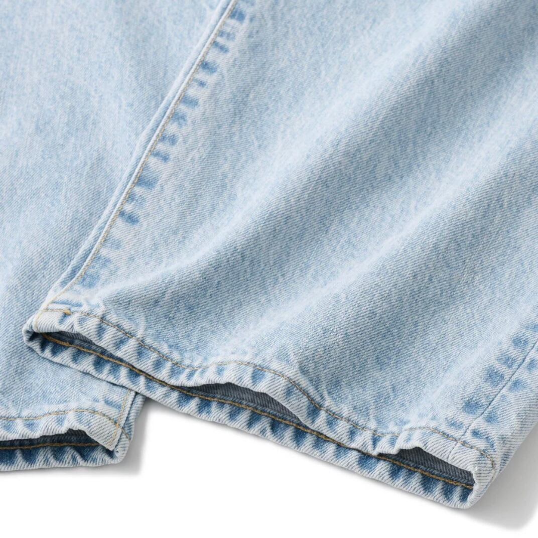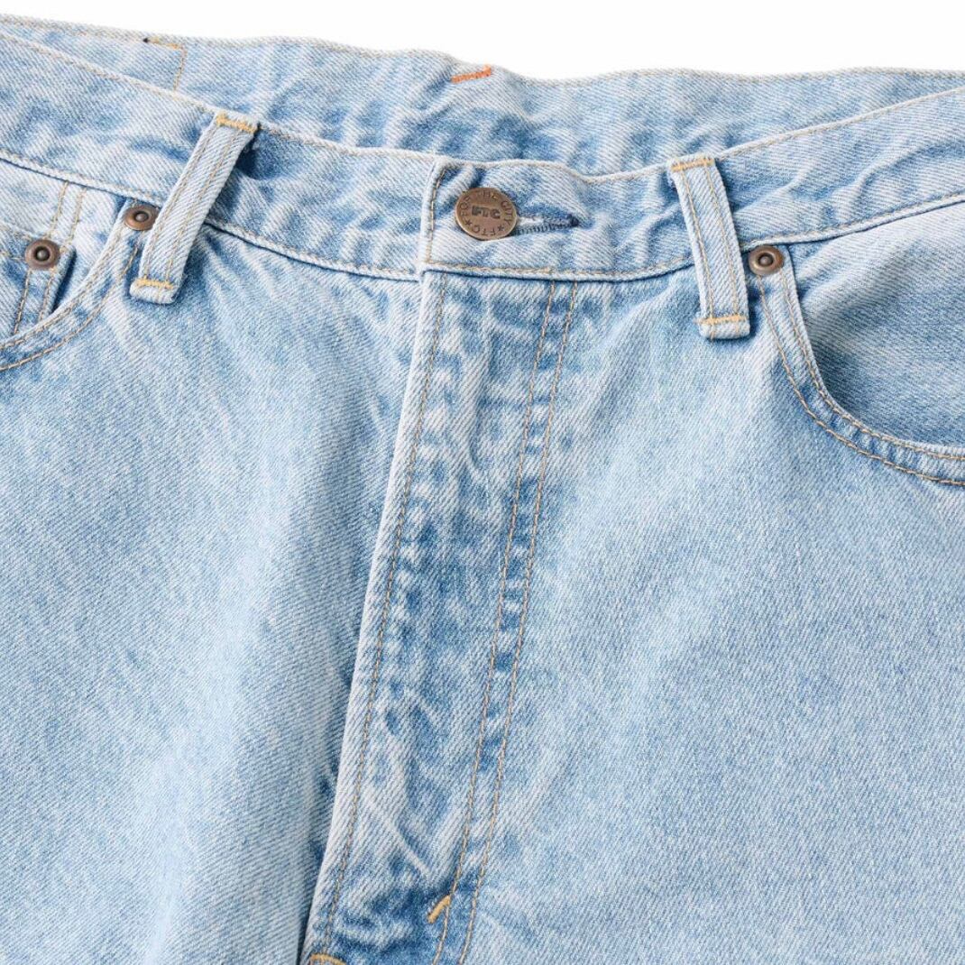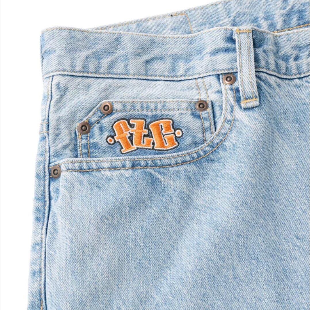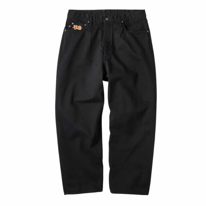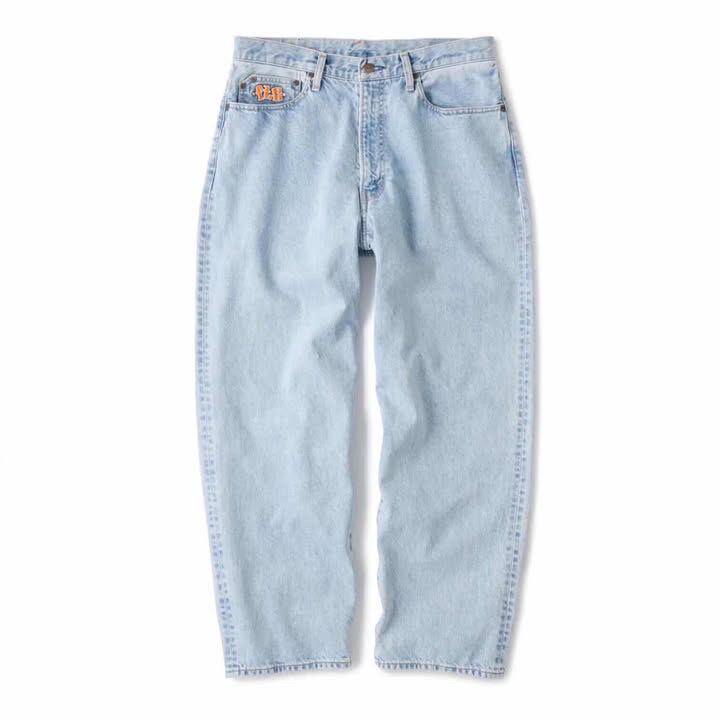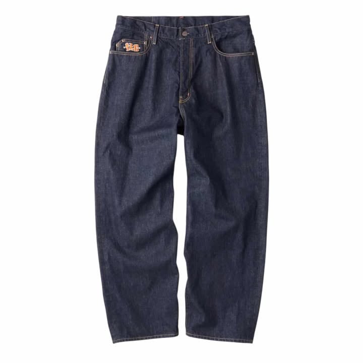 バギーシルエットの5ポケットデニムパンツ。14ozのデニムを使用。 ジッパーフライ。コインポケットに刺繍。ポケットスレキにプリント。オリジナルネオバーボタン。