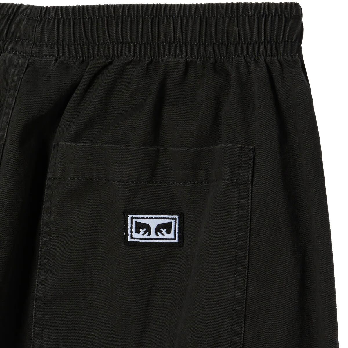 セオズイージーパンツは、ウエストは丸紐のドローコード付きエラスティック仕様で、快適な着用感のパンツです。フロントはフェイクフライデザインで、シーム上にフロントポケットを配置。バックにはパッチポケットを備え、右バックポケットにはOBEYのラベリングがあしらわれています。素材はコットン100%の6.5オンス生地を使用。レギュラーフィットで、裾にかけて細くなるテーパードレッグ仕様、裾幅は18インチです。
