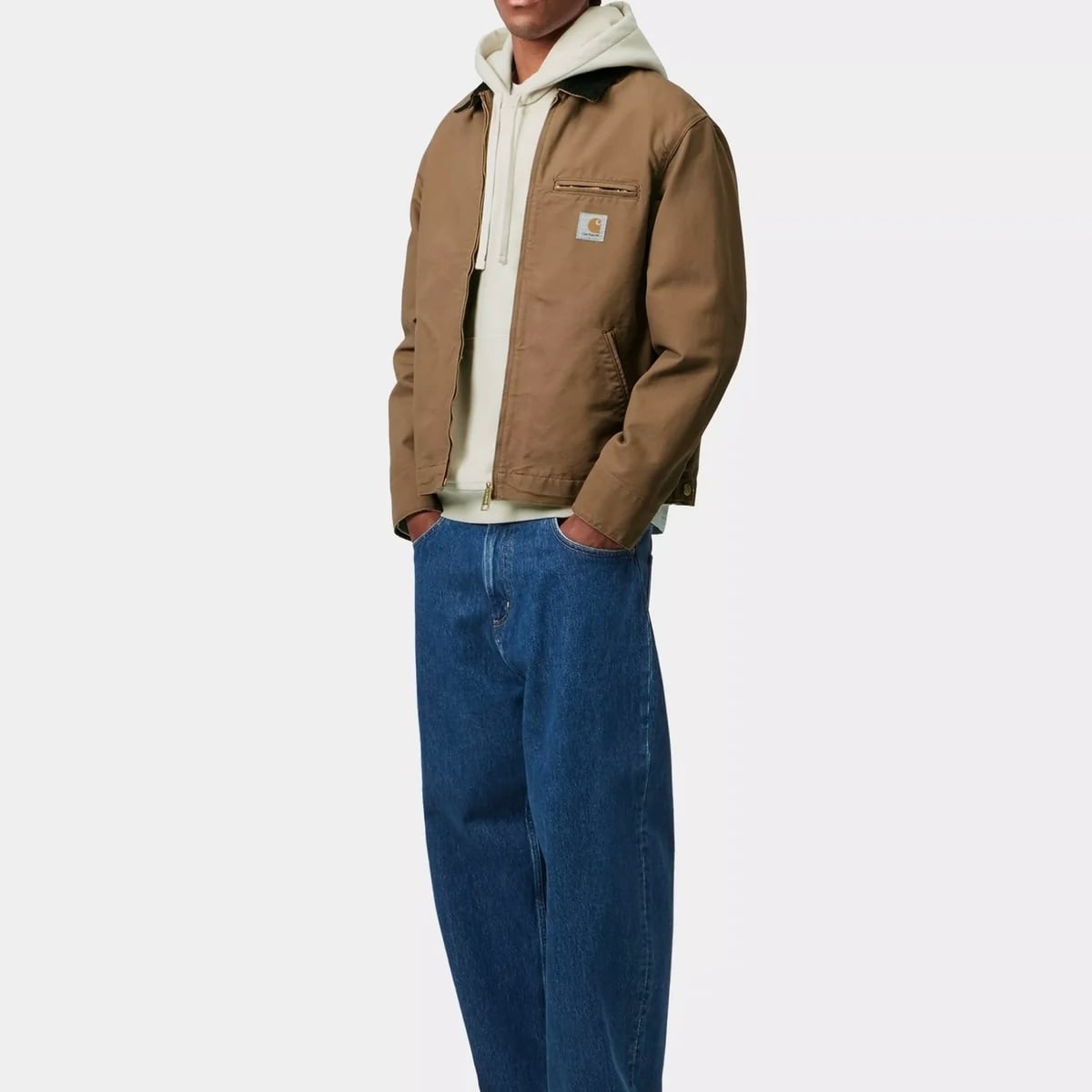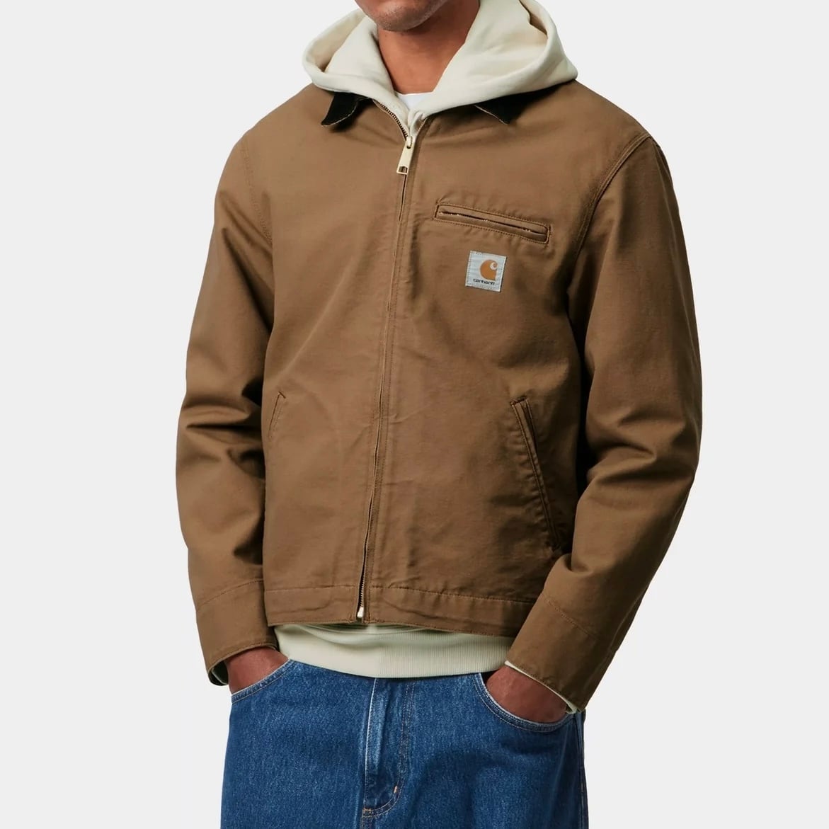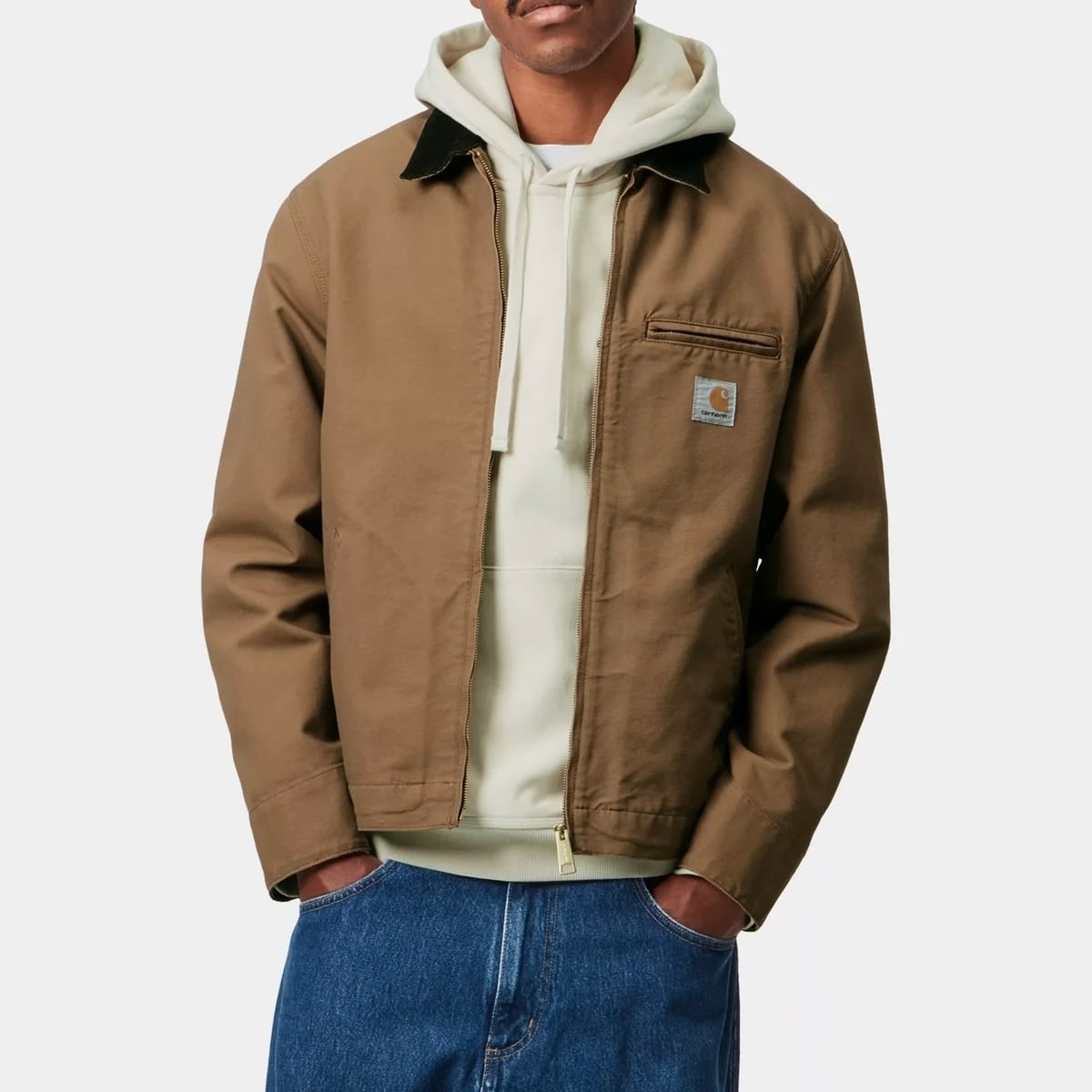 デトロイトジャケットは、厚手の12オンスディアボーンキャンバスを使用した裏地なしの春夏向けジャケットです。クラシックなワークスタイルにインスパイアされた特徴的なコーデュロイの襟や、フロントのジッパー開閉、胸元のファスナー付きポケット、さらに袖口や裾バンドのスナップボタンによる調節機能など、ディテールにこだわったデザインが魅力です。胸元にはCarhartt WIPスクエアラベルがあしらわれ、ブランドのワークスタイルに忠実なアイテムに仕上がっています。