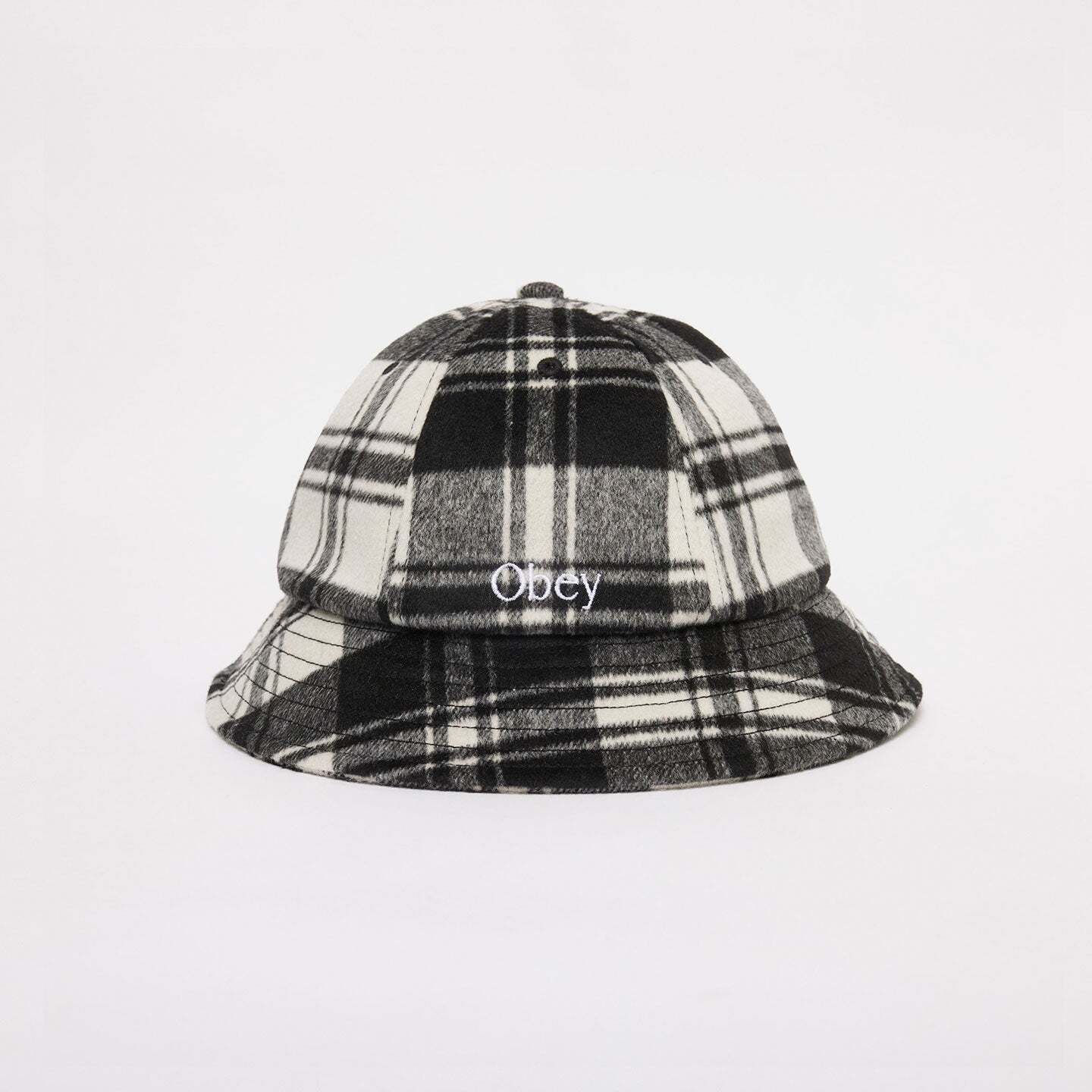 GRAND BUCKET HATは、ポリエステルとウール生地を使用した季節感あるチェック柄のシンプルなメトロハットです。小さく入ったOBEYロゴの刺繍もアクセントになっています。