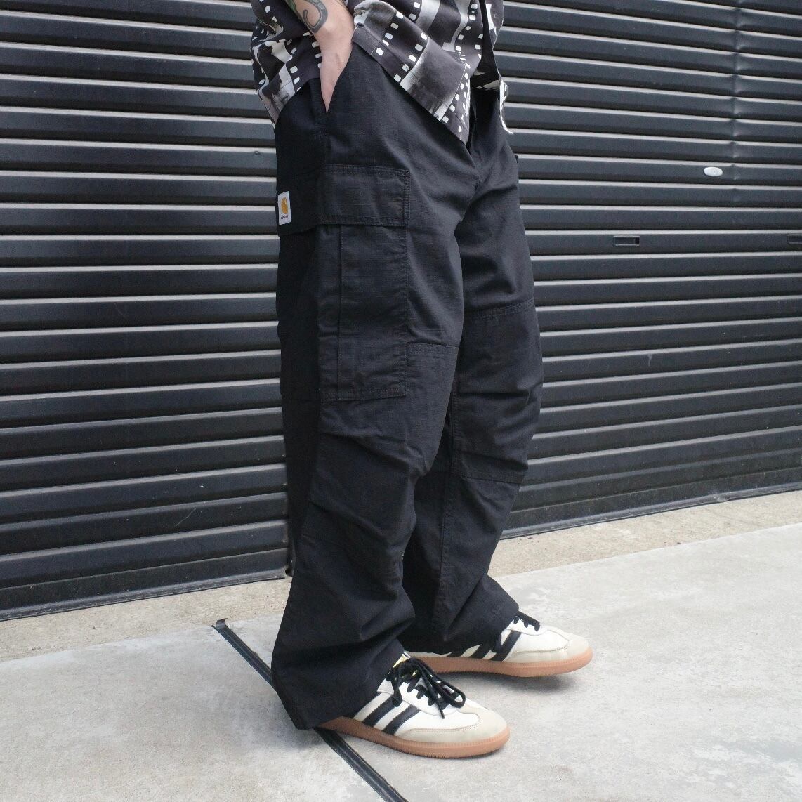 コットンリップストップ素材を使用したジェットカーゴパンツ。ミリタリーにインスパイアされたスタイルは、レギュラーウエストでシルエットはゆったりとしたエクストラルーズフィット。二重になった膝のプリーツがボリュームをプラス。伸縮性のあるウエストバンドとレッグオープンがフィット感を調整。両サイドにポケット、後ろにポケットが2つ、両足にカーゴポケットが1つ付いている。カーハートWIPのスクエアラベルが全体のデザインを引き締めている。